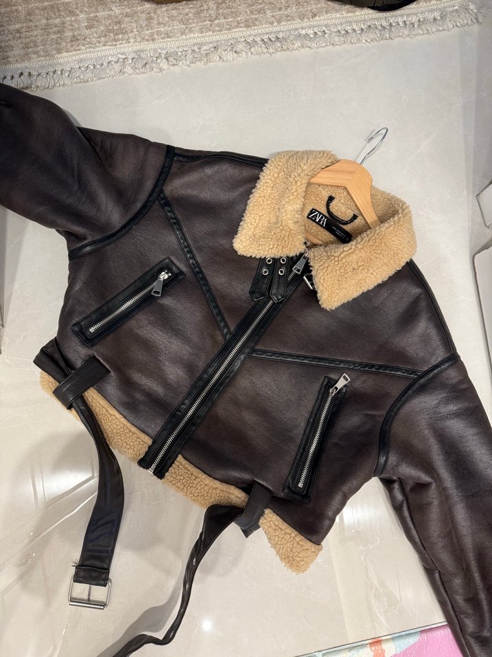 Zara Kahverengi Deri Kemerli Mini Biker Ceket