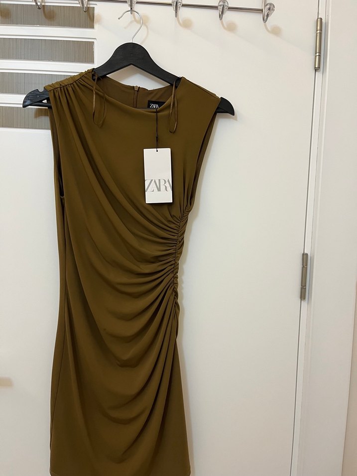 Zara markalı, kahverengi, drapeli ve v yaka kesim midi elbise. Kolsuz ve dar kesim, minimalist sokak stili için uygun. Günlük kullanıma uygundur.
