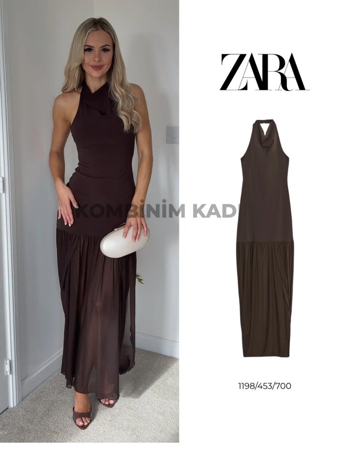 Zara Kahverengi Drapeli Uzun Elbise
