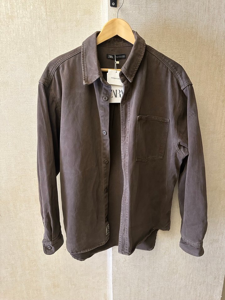 Zara marka, kahverengi kalın kumaştan, uzun kollu, düğmeli ve cepli erkek gömleği. Salaş kesimli ve normal boyda, günlük rahat kullanıma uygun.