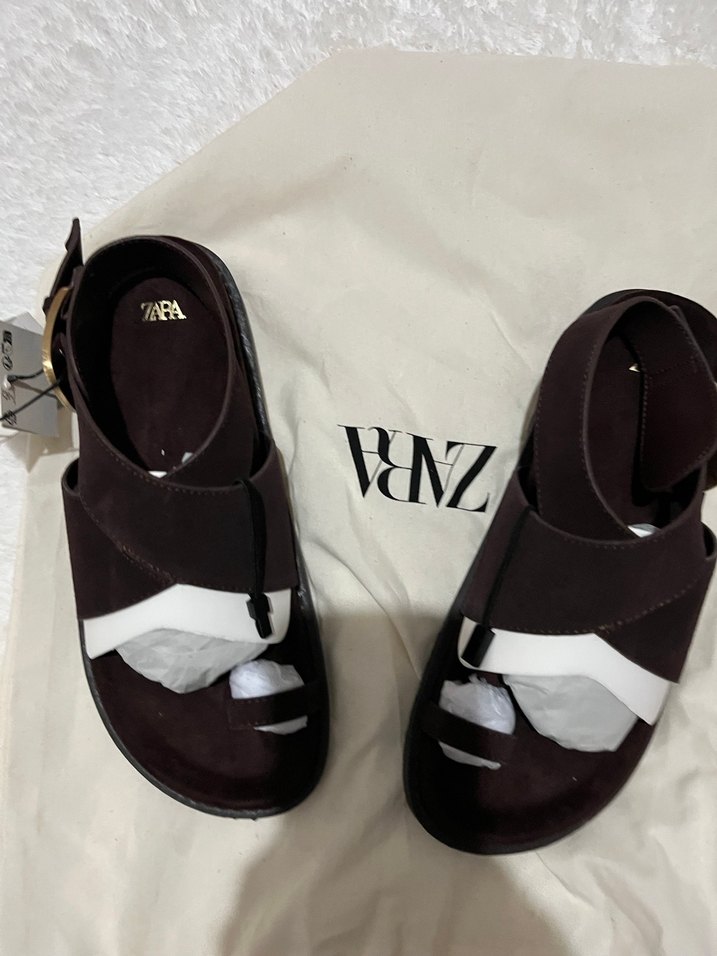 Kahverengi, tokalı bantlı, kauçuk malzemeden yapılmış kadın dolgu topuklu sandalet. Minimalist ve desensiz, günlük kullanıma uygun. Marka: Zara.