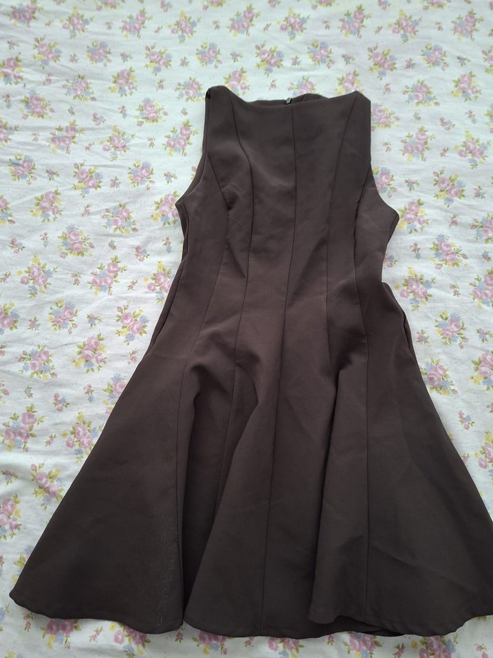 Kahverengi ve drapeli detayı var cebi de mevcuttur fitted kesim sadece arkasında fermuar yanında küçük bir kesi var görünmüyor bile bele tam oturuyor aşırı güzel bir görünüşü var