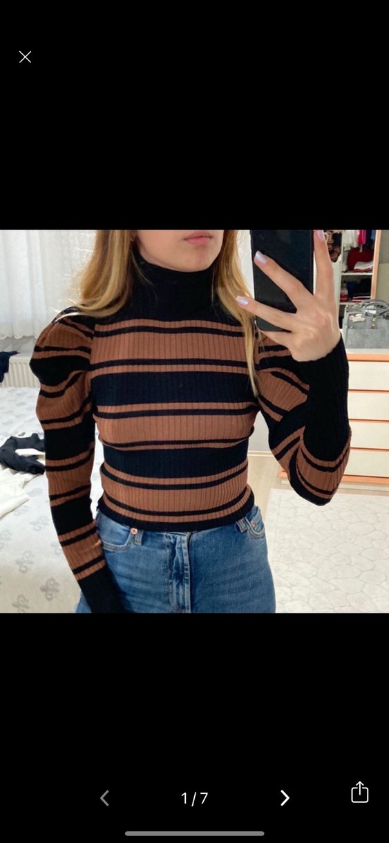 Zara Kahverengi Siyah Çizgili Balıkçı Yaka Kadın Kazak