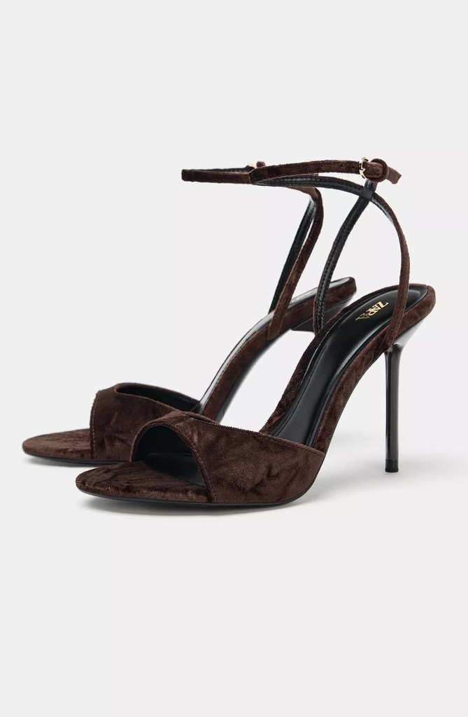 Kahverengi süet malzemeden yapılmış, yılan desenli ve tokalı bilek kayışına sahip stiletto topuklu ayakkabı. Romantik akşamlar için uygundur.