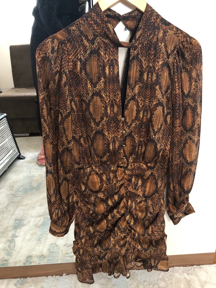 Kahverengi yılan desenli mini elbise, uzun kollu ve V yakalıdır. Drapeli ve vücuda oturan kesimiyle bohem tarzını yansıtır. Midi boyda, yumuşak sentetik kumaştan üretilmiştir.