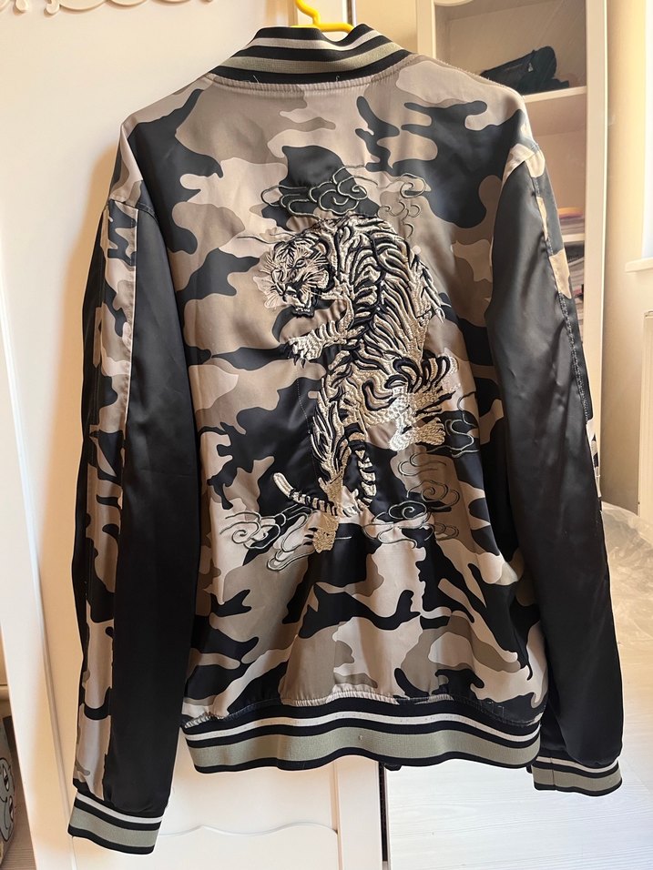 Zaradan alındı defosuz sayılı giyildi Kamuflaj desenli, sentetik kumaştan yapılmış, bol kesim, fermuarlı erkek ceket. Uzun kollu ve yakalı, günlük kullanıma uygun sokak stili.