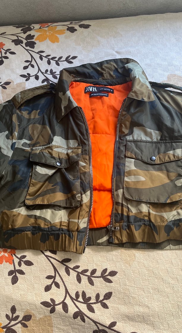 ZARA marka, kahverengi kamuflaj desenli. Sentetik kumaştan, yakalı ve fermuarlı, rahat kesim, turuncu iç astarlı.