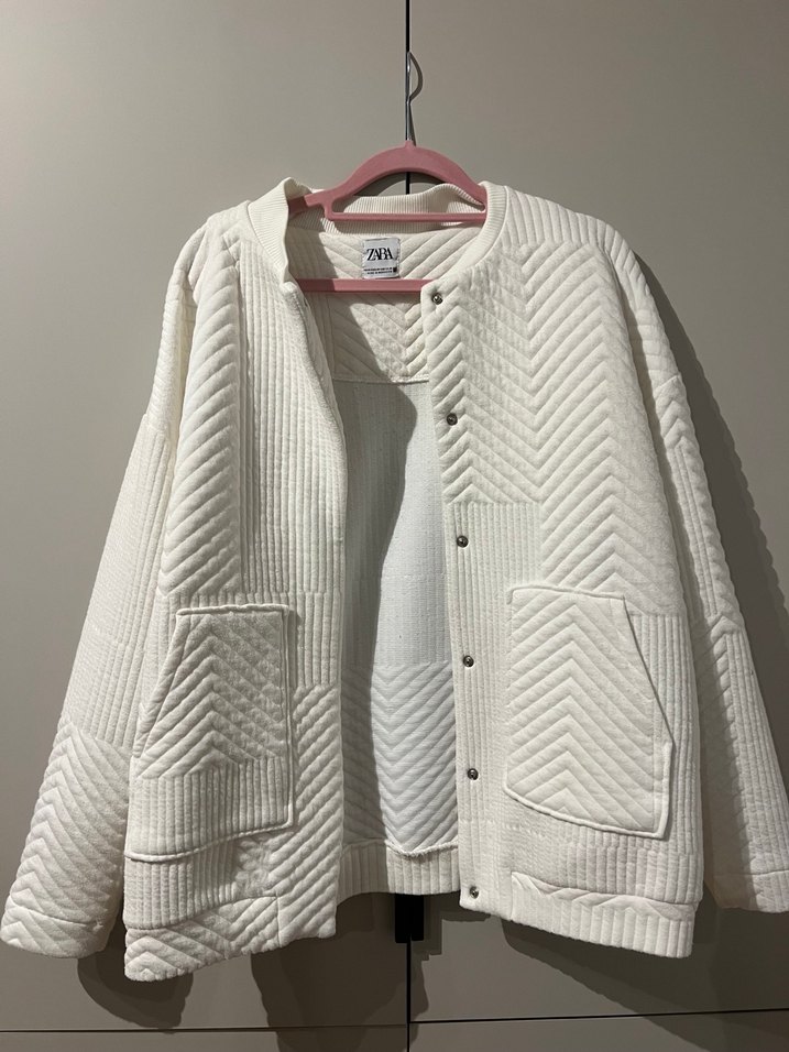 Zara, kapitone ekru ceket. Çıtçıt kapamalı ve 2 adet yan cebi var. Kolunda 4. Görselde görünen leke mevcut.XS-S uyumlu.