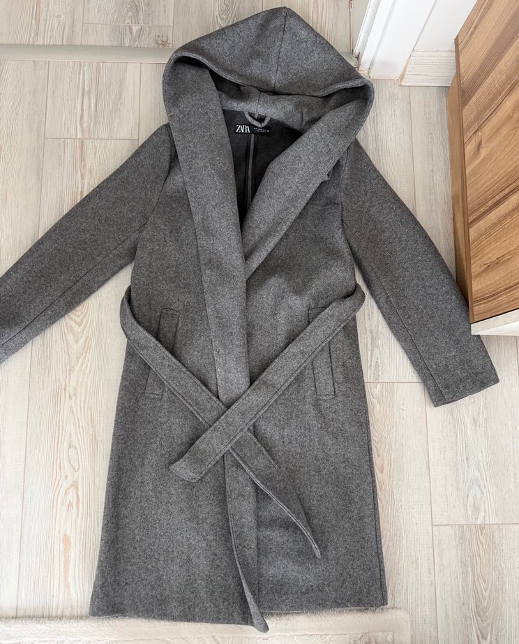 Kapüşonlu ve kemerli gri kaban, yumuşak dokulu kumaştan yapılmıştır. İki ön cepli ve rahat kullanım sağlar.