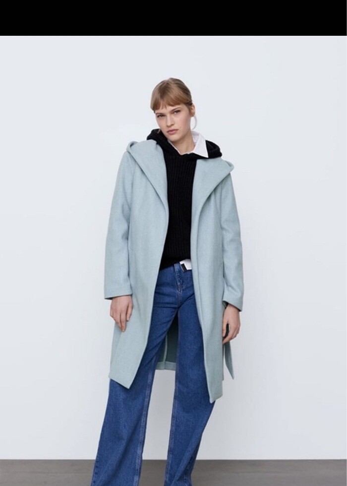 Renk açık mavi, kapüşonlu kemerli kaban, bedeni S bedeni olmadığı için kullanılmadı