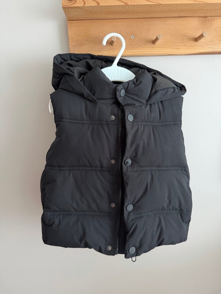 Zara marka, 86 cm, sıfır ayarında, Erkek çocuklar için düğmeli, yakalı, siyah kapüşonlu yelek. Yumuşak ve sıcak kumaştan, dar kesim, sokak stili.