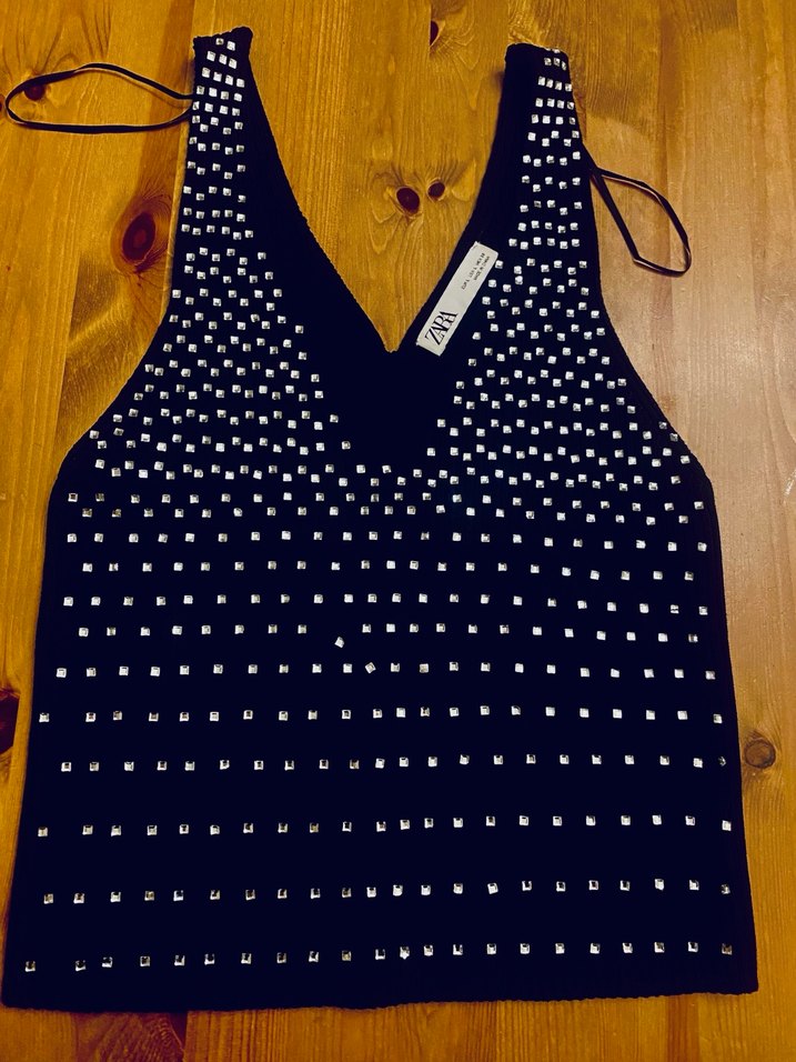 Bir kez giydim. Zara marka kare şeklinde kesilmiş parlak aynalı taşlarla önü tamamen işli ve her taşı yerli yerinde derin V yakalı, özellikle gece kıyafeti olarak tek veya ceket içine rahatlıkla kullanılabilir.