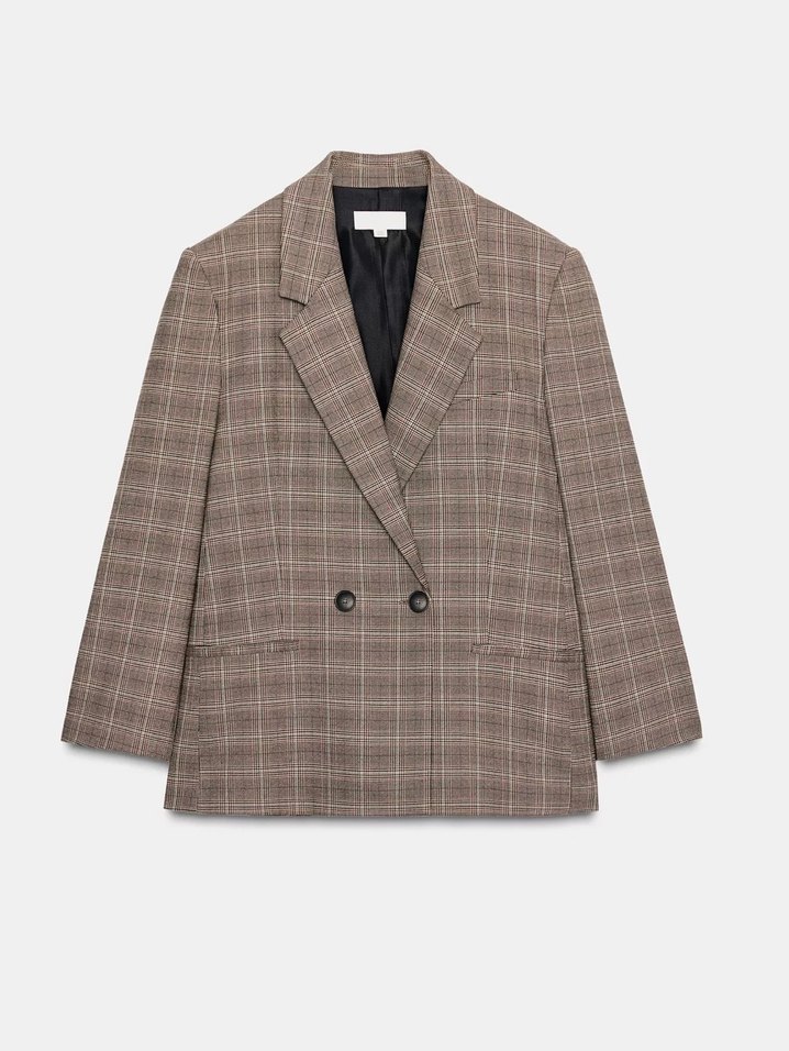 Düğmeli, ekoseli bej kadın blazer ceket, normal uzunlukta ve uzun kolludur. Ofis ve sokak stiline uygundur.