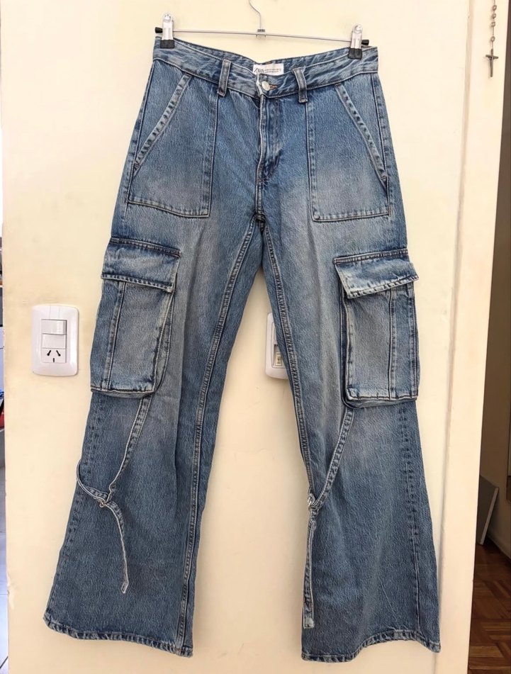 Pastel mavi kargo jean pantolon. Büyük yan cepleriyle günlük sokak stiline uygundur. Herhangi bir deformesi yoktur.