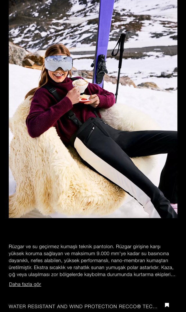 Yeni etiketli zara online uygulamasından alındı su geçirmez soğuğa dayanıklı omuz askıları ayarlanabilir çığ altında yerinizi tespit etmesini sağlayan recco teknolojisine sahiptir. Yüksek performanslı nanomembran kore kumaşıyla tasarlanmıştır. Nefes alabilir teri vücudunuzdan uzak tutar. Suya dayanıklıdır, 9.000 MM’ye kadar su basıncına karşı dayanıklıdır.Üstte duruşu çok güzel bir pantolon kaçırmayın