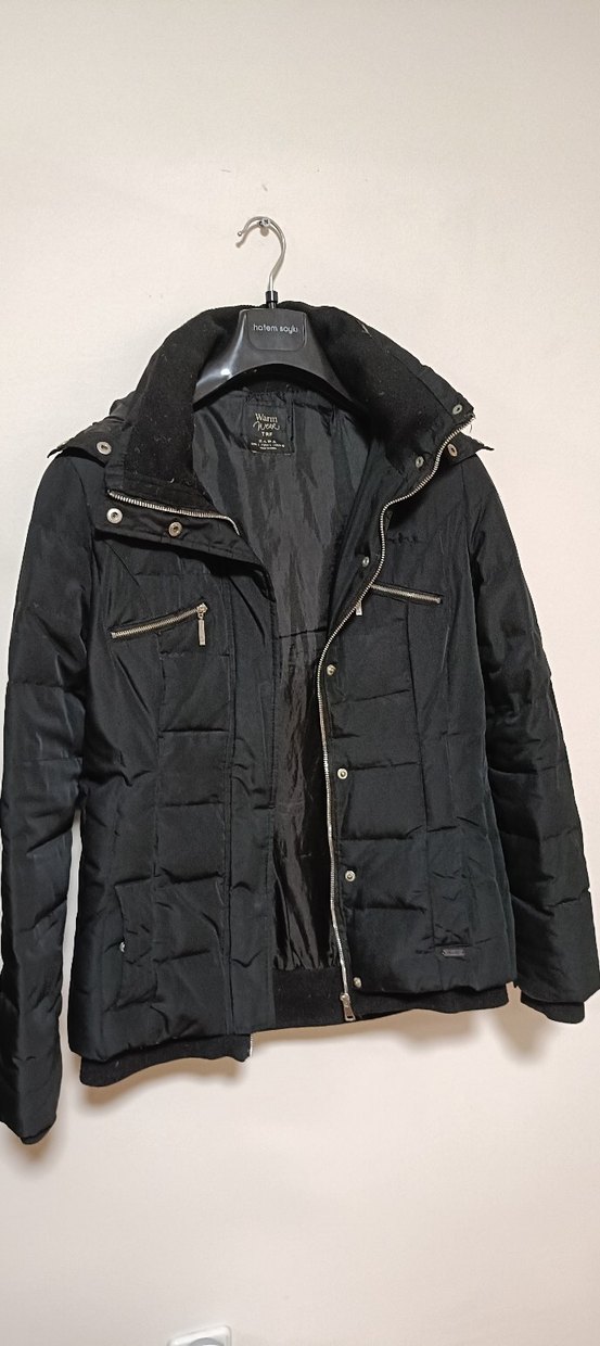 Kaz tüyü orjinal zara Fermuarlı cepleri ve kesik yaka detayı olan siyah, normal uzunlukta, temiz kullanılmış