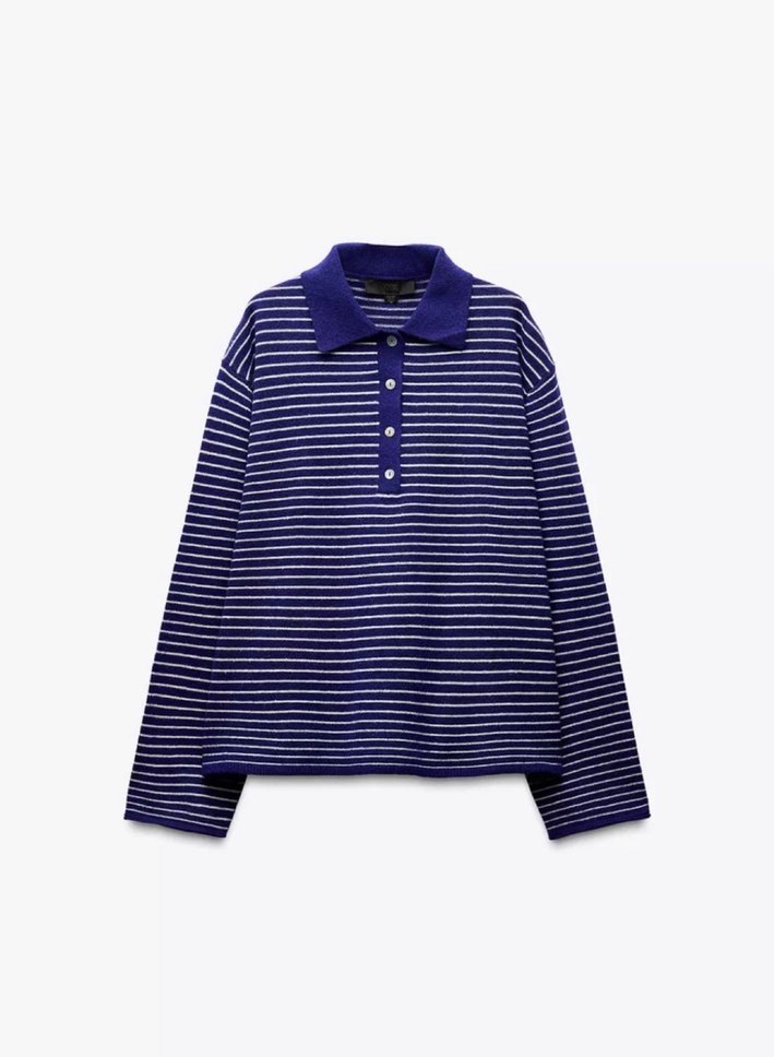 Bu lacivert çizgili triko sweatshirt, yakalı ve uzun kolludur. Yumuşak, sıcak kumaştan örülmüş, rahat kesim ve normal boydadır, günlük kullanıma uygundur Small beden yeni ve etiketlidir.
