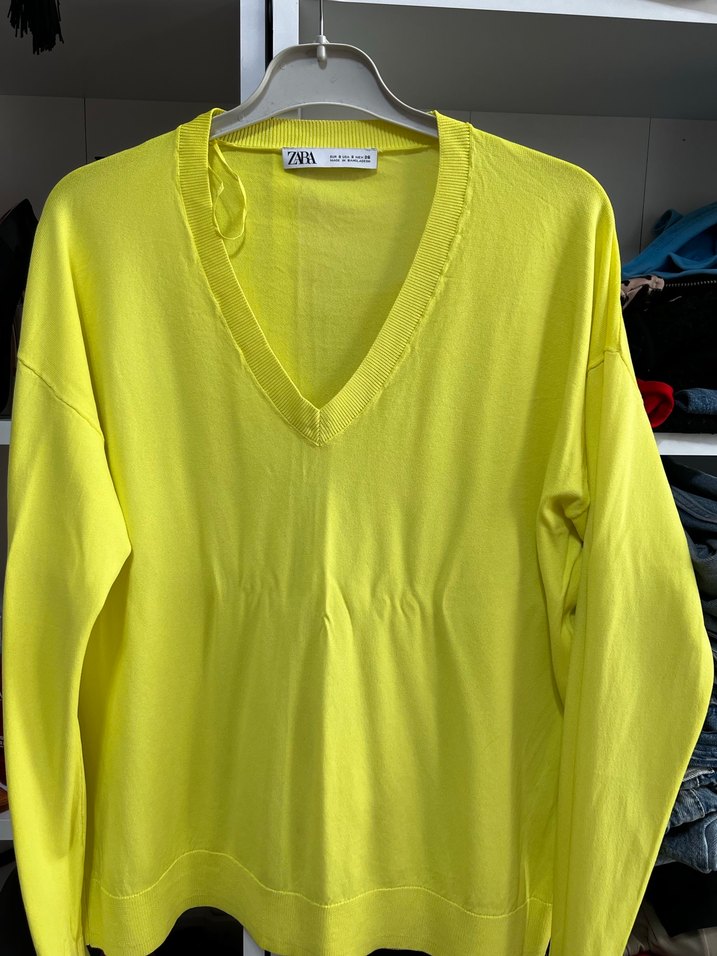 Yumuşak keten kumaştan, uzun kollu, V yaka ve düğme detaylı sarı bol kesim kadın triko. Günlük sokak stili için uygun.