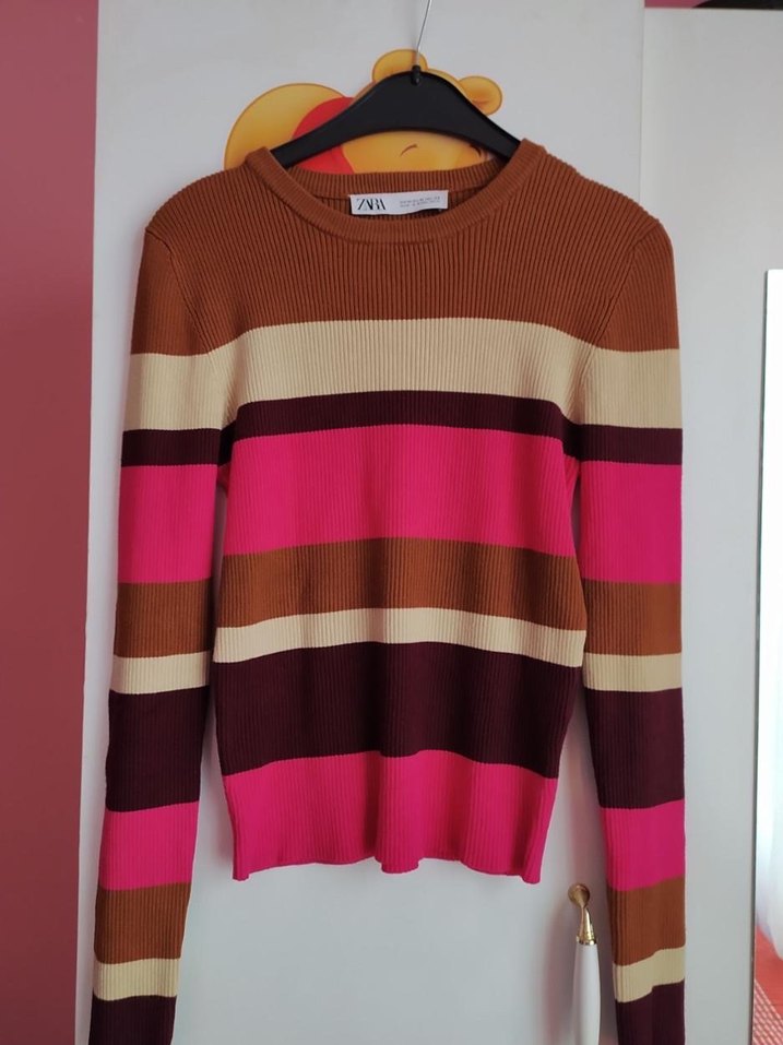 Uzun kollu, bisiklet yakalı ve çizgili desenli, kahverengi tonlarında örgü kadın kazak. Rahat ve şık, günlük sokak stiline uygun.