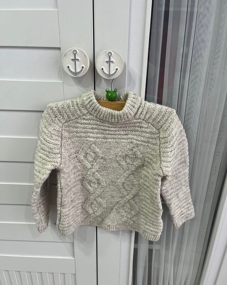 Krem rengi örgü kazak, uzun kollu ve yuvarlak yakalıdır. Gevşek kesimi ve örgü dokusuyla günlük kullanıma uygundur.