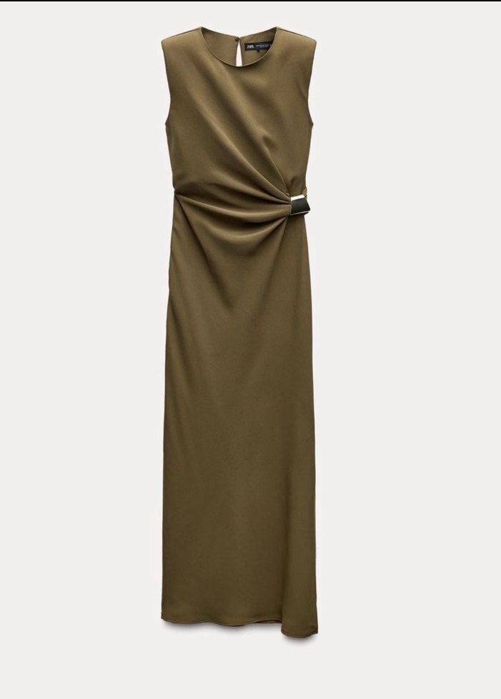 Kemer detaylı, kolsuz, haki uzun elbise, regular kesim ve çağdaş straplez yaka ile ofis kullanımı için uygun. Zara markadır