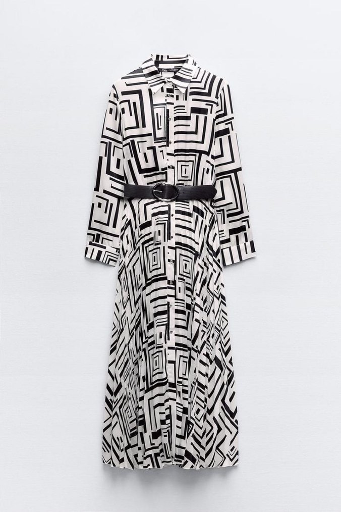 ZARA KEMERLİ DESENLİ SATEN ELBİSE // Uzun kollu, yakalı elbise. Kemer detaylı ve pilili kenarlı etek detaylı. Önü düğmeli. Zara’nın online sitesinden alındı. Yeni etiketli orijinal.