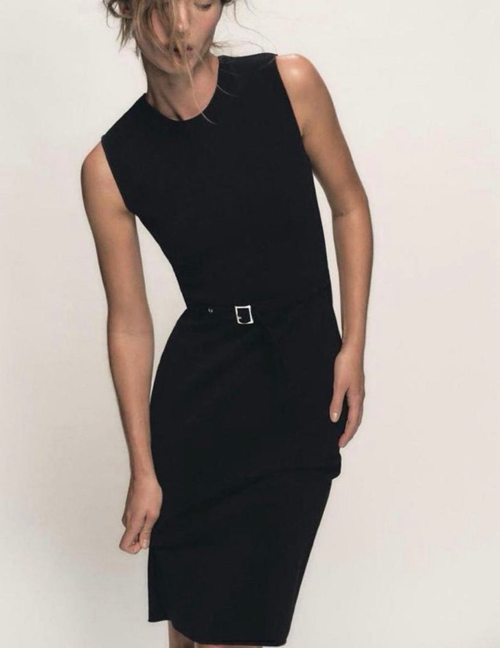 Kemer detaylı, likralı siyah kalem elbise. Diz boyunda, kolsuz ve ofis için uygun, cesur ve çağdaş bir tasarım. Zara marka
