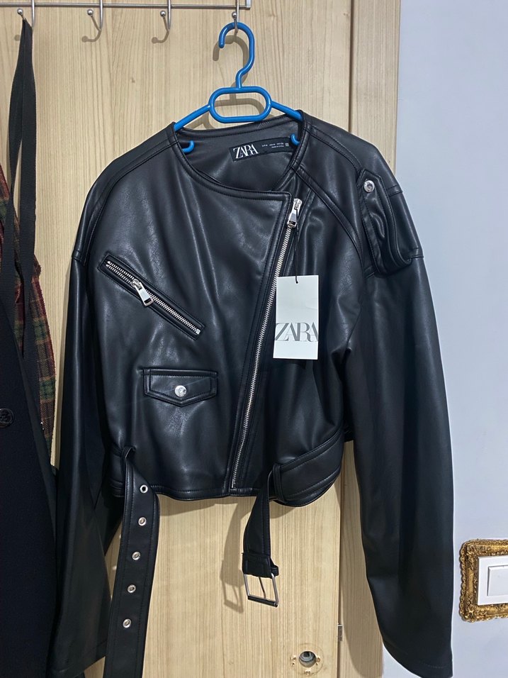 Zara'nın kemerli, kısa kesim, siyah deri biker ceketi, strappy kollu ve yakası notched lapel tarzındadır. Günlük kullanıma uygundur.