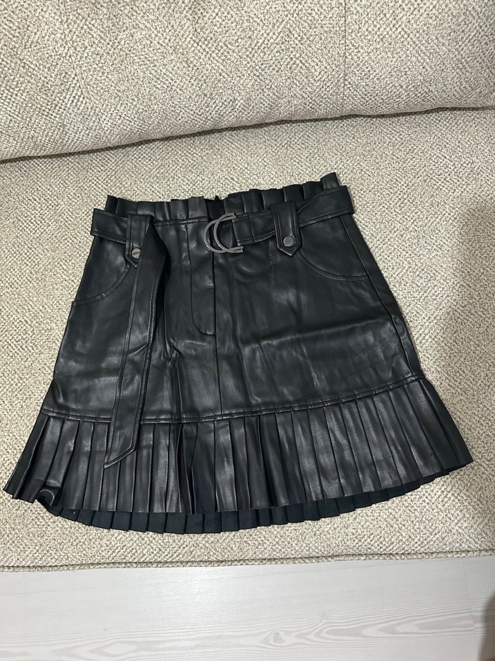 Bu kemerli siyah deri mini etek, fitted kesimi ve pileli etek. Hiç giyilmedi