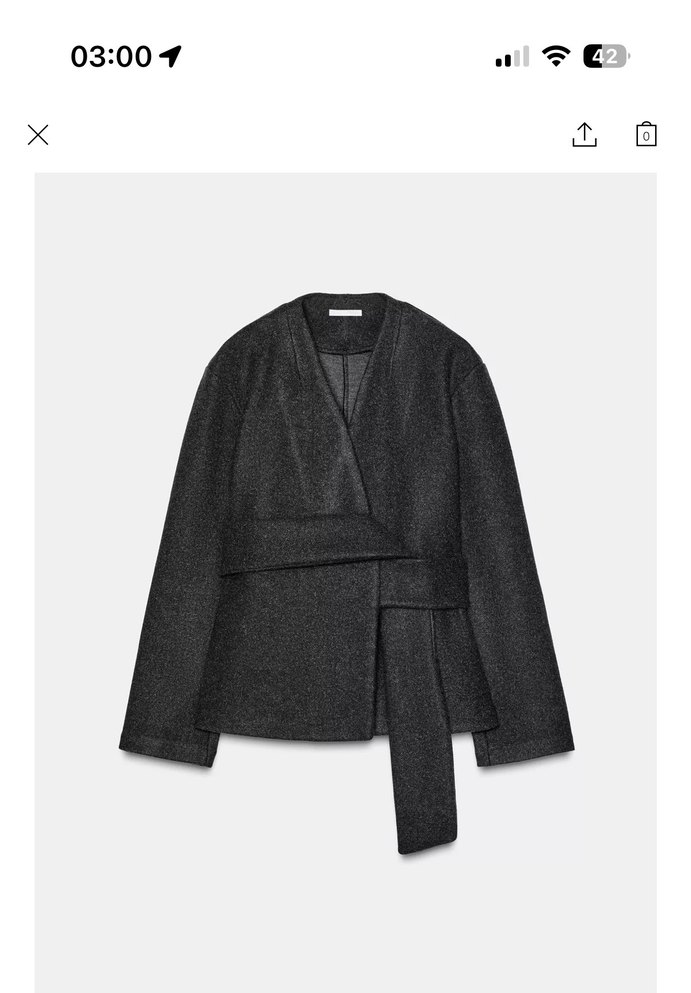 Kemerli bel, sivri yaka ve uzun kollu siyah kadın ceketi. Sentetik kumaştan, kısa kesim ve minimalist tasarıma sahip. Ofis kullanımı için uygun.