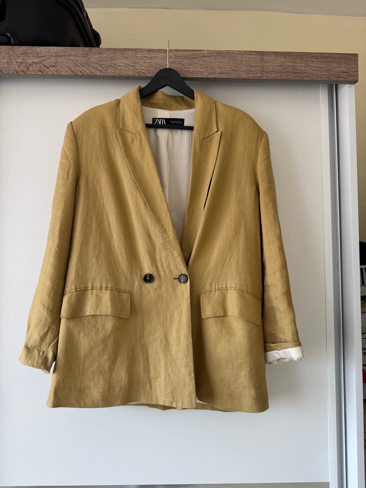 Ürün iyi durumda, keten bir ceket, hardal renginde bazı yerlerinde çok hafif renk solmaları var ama belli etmiyor