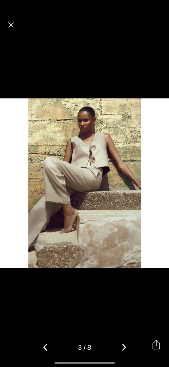 Yeşil keten kumaştan, düğmeli ve kollsuz kadın yeleği ve keten pantolon takımı. Minimalist, bohem tarzda, kısa ve normal kesimdir. Günlük kullanıma uygundur.