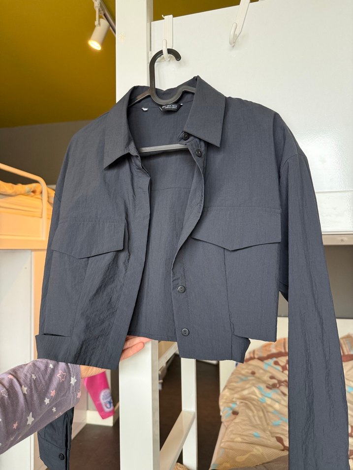 Crop kesim antrasit keten kumaştan, düğmeli, uzun kollu bol kesim kadın gömleği. Trendy casual ve iş stiline uygundur.