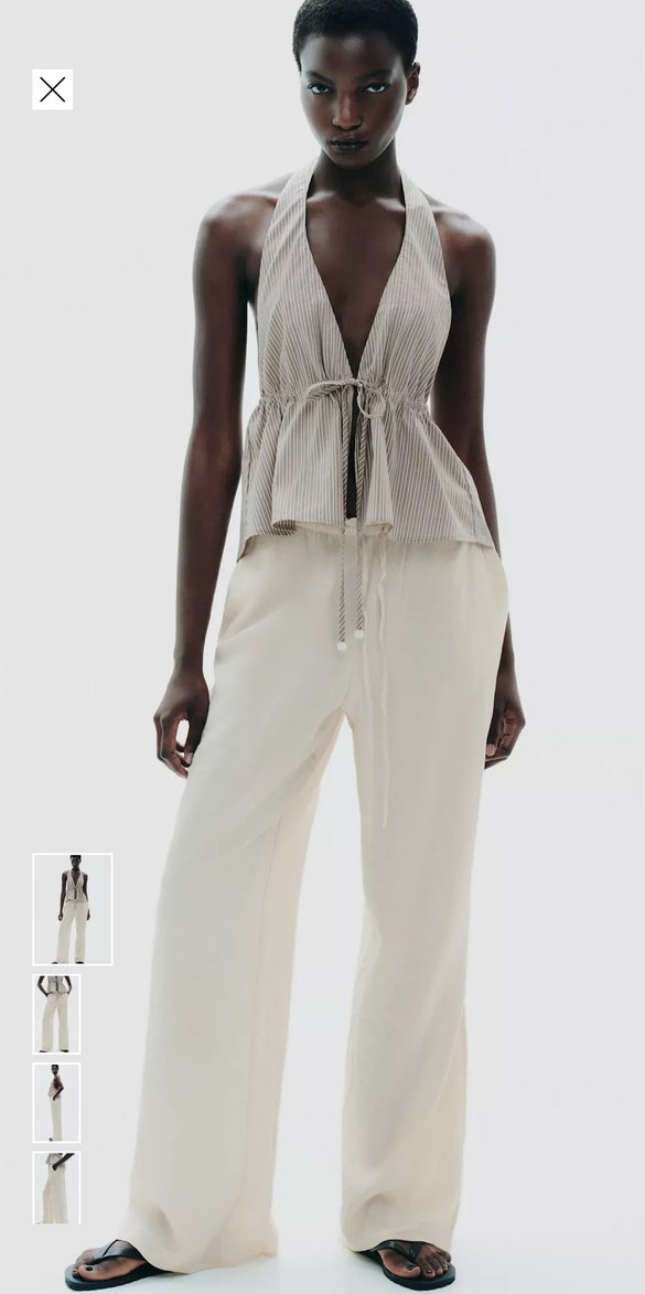 Bej renkli, keten kumaştan yapılmış, kemerli ve çizgili desenli kadın pantolon. Rahat kesimi ve normal boyu ile günlük kullanıma uygundur.