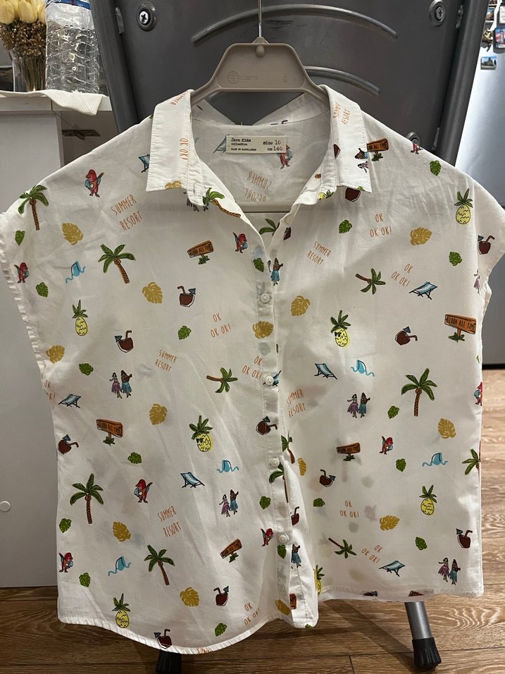 Zara marka, orijinal. Zara kids. Yumuşak pamuklu kumaştan, düğmeli ve yakalı, kısa kollu, bol kesim gömlek. Beyaz zemin üzerine renkli desenlerle günlük sokak stiline uygun.