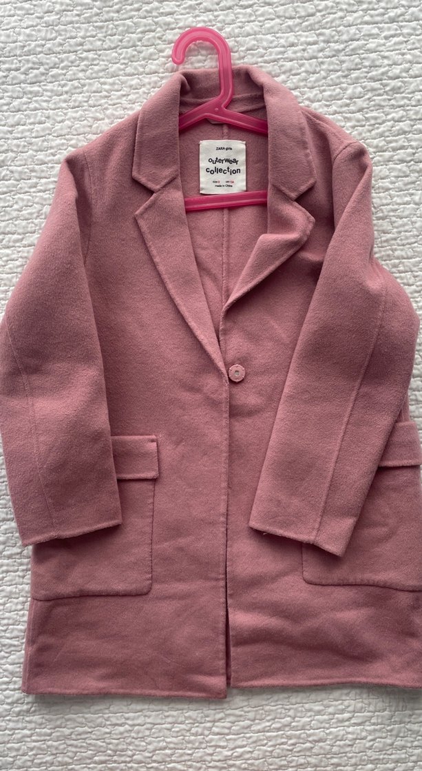Zara marka kız çocuk kaşe kaban, düğmeli ve geniş yaka detayıyla. Yumuşak ve sıcak kumaştan, uzun kollu, rahat kesim, gündelik şıklık için ideal.