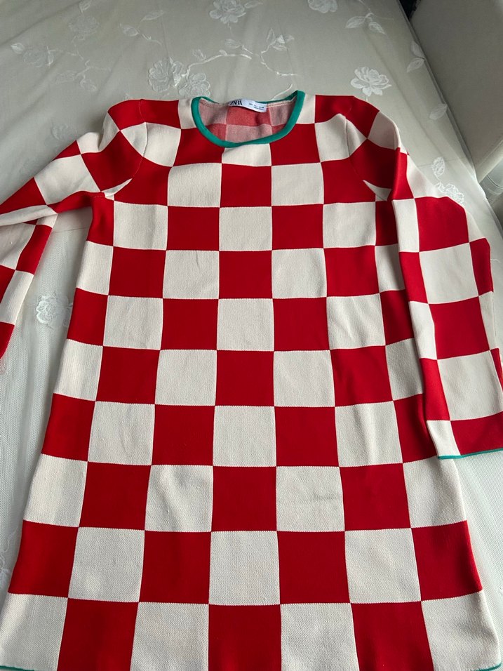 ZARA kırmızı beyaz kareli, uzun kollu, yuvarlak yakalı, triko dokuma kumaştan, günlük kullanıma uygun, dar kesim kadın ELBİSE