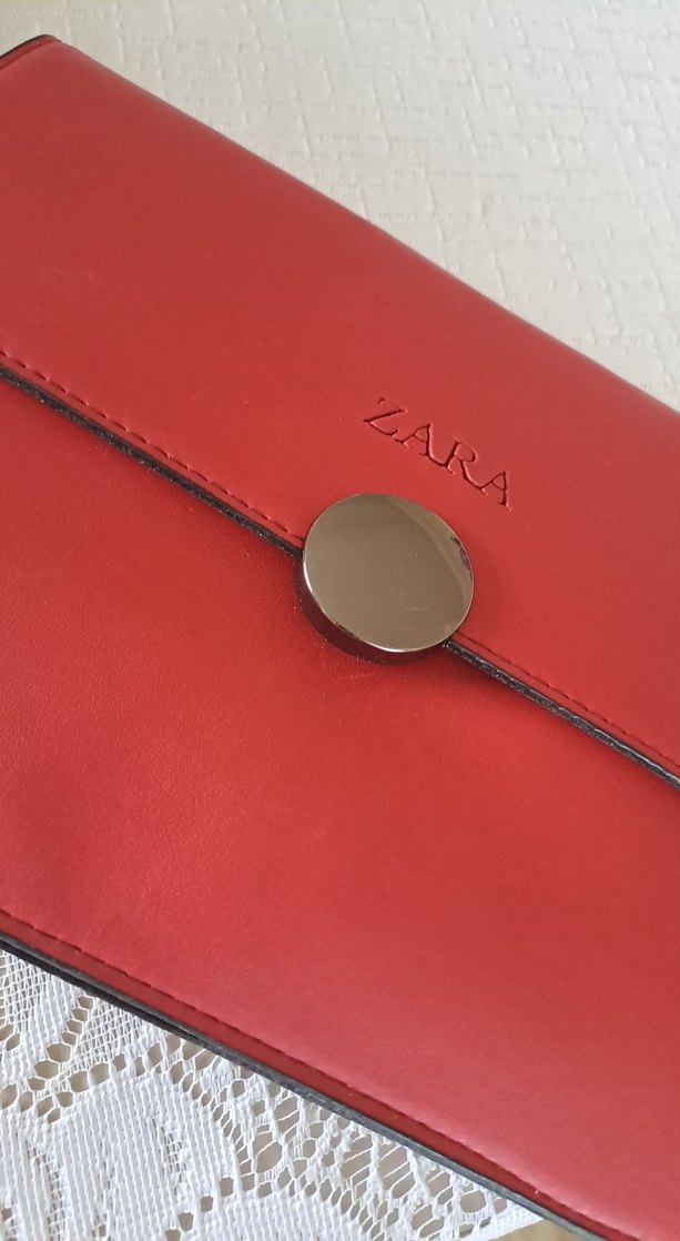 Zara marka, kırmızı deri kadın çanta, tokalı kapama ve minimalist desenle modern klasik stile sahiptir. Günlük ve davet kullanıma uygundur. Hicbir problemi yoktur.