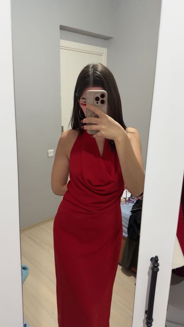 Kırmızı, drapeli V yakalı ve kolsuz, sırtı açık vücuda oturan midi elbise, romantik akşamlar için uygundur.Henüz daha dışarıya giymedim.
