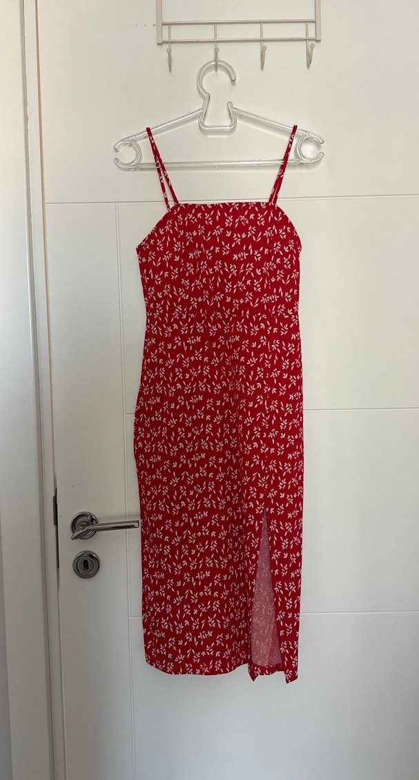 İnce askılı, straplez yakalı ve drapeli kırmızı midi elbise. Hafif sentetik kumaştan, günlük rahat kullanım için uygundur. Yırtmacı çok şık duruyor. Basic ve üzerine gömlekle de güzel kombinleniyor.