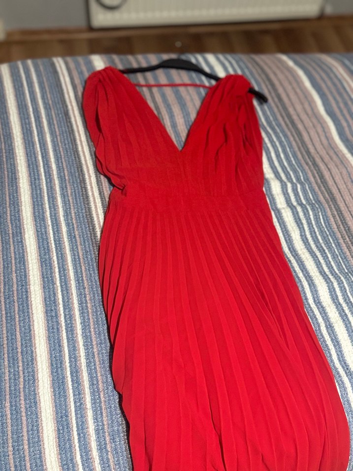 Zara Kırmızı Pilili V Yaka Uzun Abiye Elbise