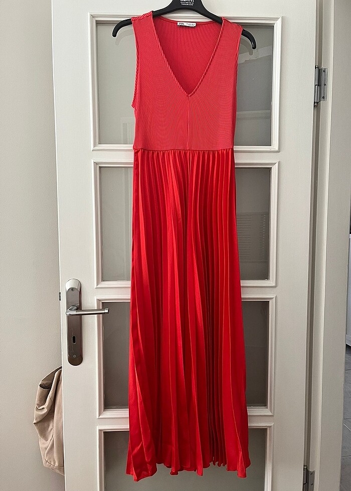 Zara kırmızı, kolsuz, pilili etekli elbise. M beden, çok az kullanıldı