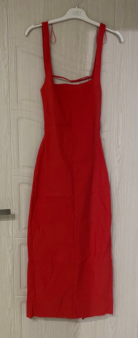 Bulmak için çok uğraştığım bir elbiseydi. Bedeni bana büyük gelmese asla satmazdım. Modeli ve kalıbı çok güzel. O kadar güzel bir kırmızısı var ki. Uzun bir elbise arkadan düzeyli bir yırtmacı var. Sırt dekoltesi var, ip detayıyla. Dileyen iş ortamında üstüne ceketle giyer. Dileyen yaz günü normal elbise olarak. Keten, pamuk ve elastan karışımlı bir kumaşı var. Basit bir kumaş değil. 2024’te 1350 TL’den satın aldım. En çok beğenen insana gider ve güzel günlerde kullanır umarım. Teşekkür edeceğiniz bir parça. Kırmızı yakışıyorsa kaçırmayın. Pazarlık payı vardır.