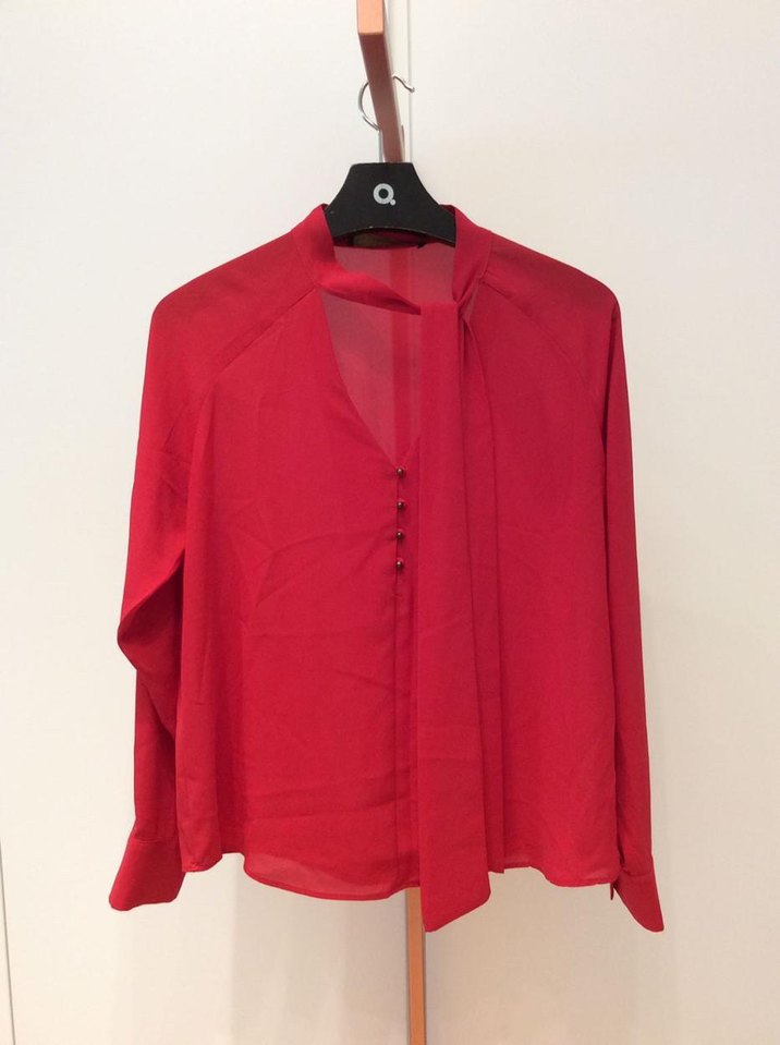 Kırmızı, uzun kollu, V yakalı ve düğmeli kadın gömleği. İpeksi kumaştan, bol ve midi uzunlukta, modern ofis stiline uygun. ✨ #zara kırmızı şifon #bluz sadece 1 kez giydim , tüm detayları çekimde mevcut, temiz teslim