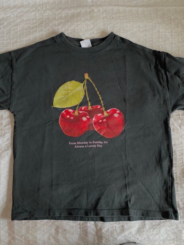 Zara Kısa Kollu Kiraz Baskılı Siyah Tişört
