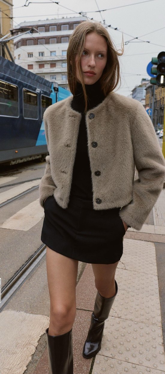 Uzun kollu, bol kesim kısa suni kürk ceket, yumuşak süet malzemeden. Kahverengi ve gri tonlarda, desen içermeyen sade tasarım, günlük sokak stili için uygun. Ölçüleri görselde mevcut. Renk bej