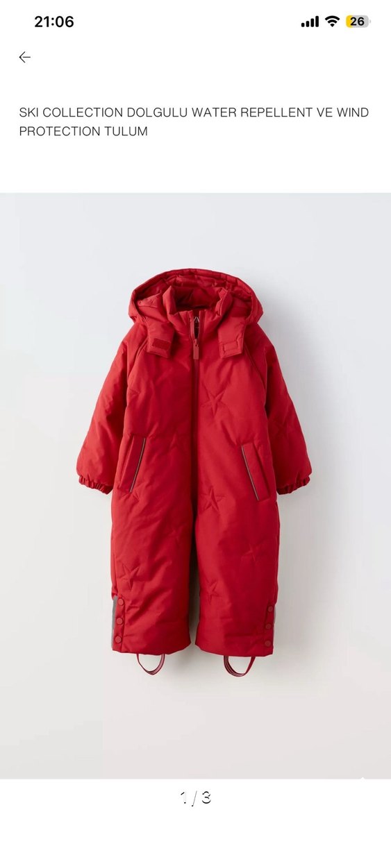Canlı kırmızı renkte kız bebek tulumu, fermuarlı ve kesik yaka detaylıdır. Elastik manşetleri ve ayarlanabilir ayak kayışları bulunur. ❄️
