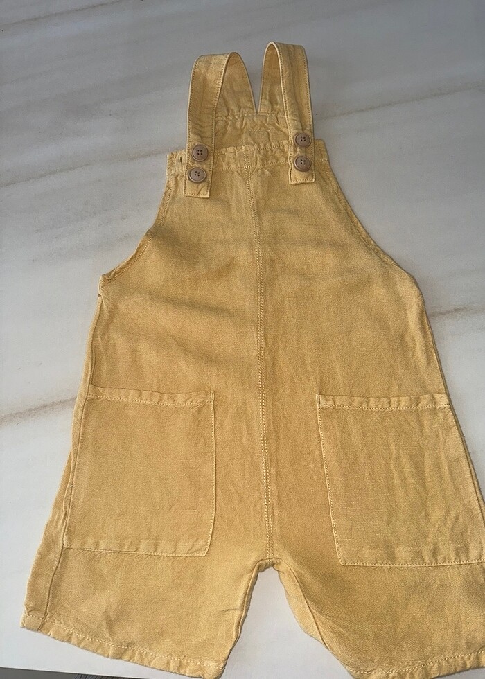 Zara çocuk keten karışımlı kısa tulumu. Omuzlardan düğmeli, 2 farklı boy ayarlanıyor. Ön cepleri var. Tek bir küçük kusuru var fotoda gösterdiğim gibi keçe kalemin lekesi, yan üst tarafta olduğu için görünmüyor fazla. 2-3 yaş için uygun.