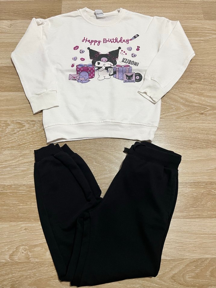 Uzun kollu, baskılı beyaz sweatshirt ve siyah bol kesim eşofman takımı. Örgü yumuşak ve sıcak kumaştan üretilmiştir.