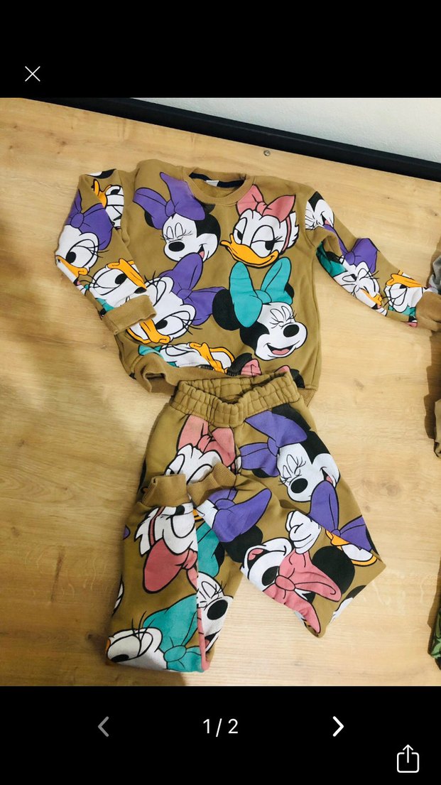 Sentetik kumaştan, çok renkli baskılı, uzun kollu, düğmeli ve yuvarlak yakalı bol kesim kız çocuk sokak tarzı takım. İçi polarlı. Yıkamadan kaynaklı hafif renk solmaları var